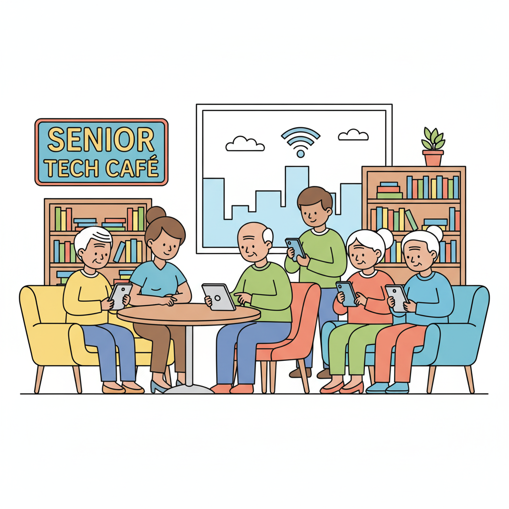 Regular drop-in sessions at senior centers where older adults get help with smartphones, tablets, and staying connected with family