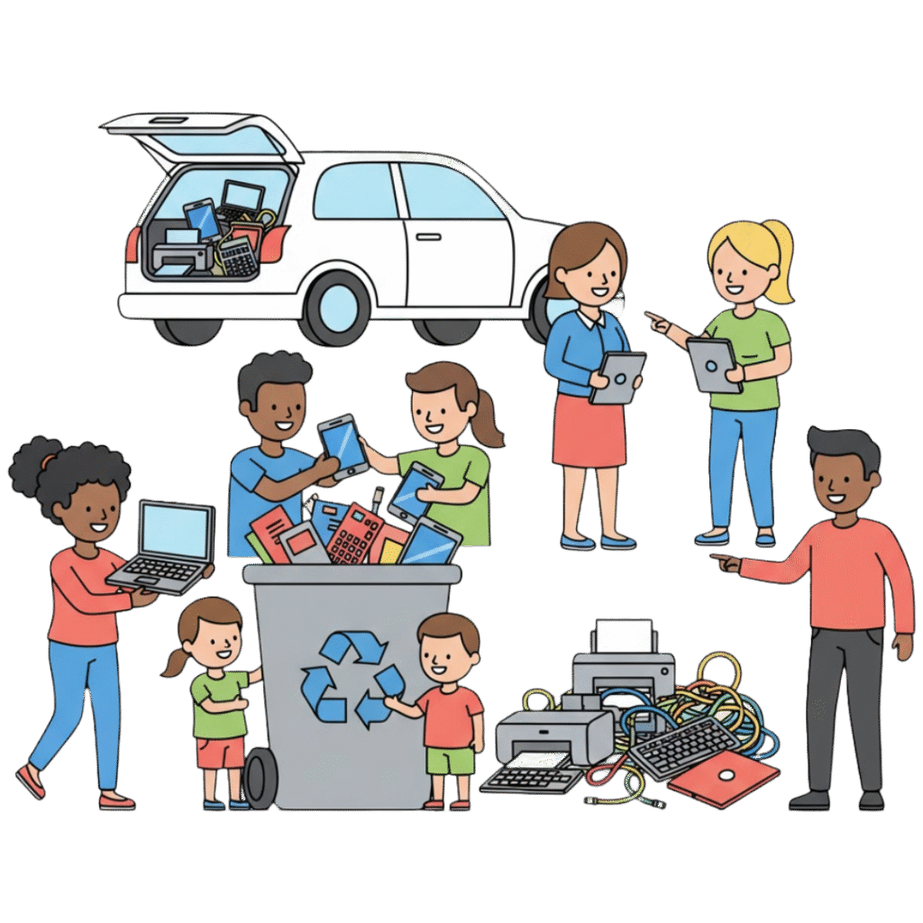 Community collection events that keep toxic materials out of landfills while recovering devices for refurbishment. Partner with us to host a drive at your school, business, or organization.