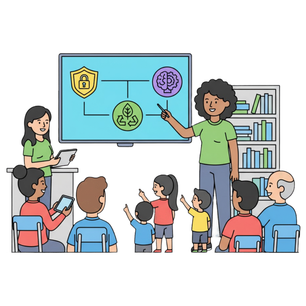 Interactive workshops on cyber safety, AI literacy, and sustainability at schools, libraries, and community centers. Education that empowers communities to navigate technology safely and responsibly.